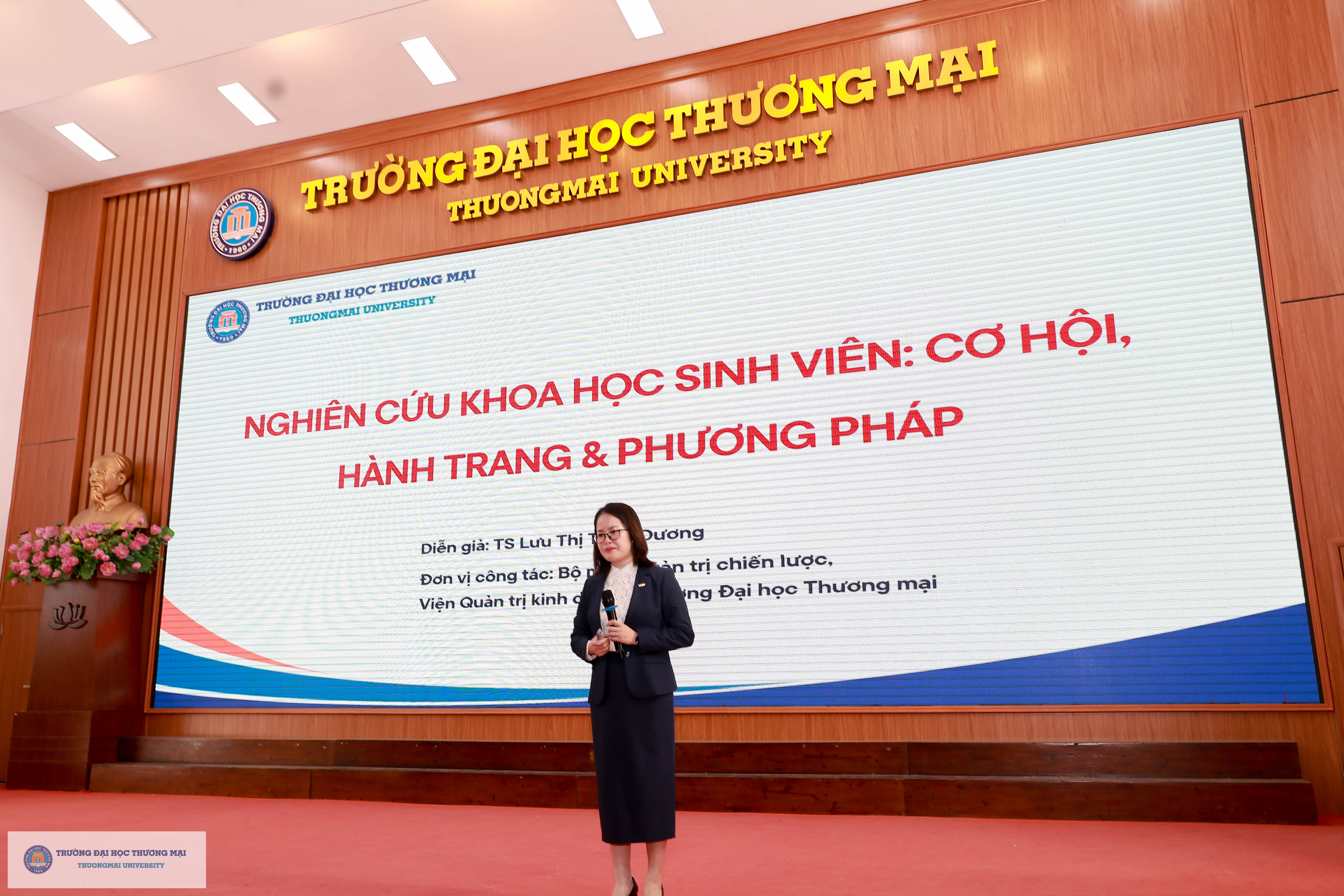 PGS,TS. Lưu Thị Thùy Dương - Phó Trưởng bộ môn Quản trị Chiến lược, Viện Quản trị Kinh doanh với báo cáo “Cơ hội, hành trang và phương pháp trong NCKH sinh viên”;